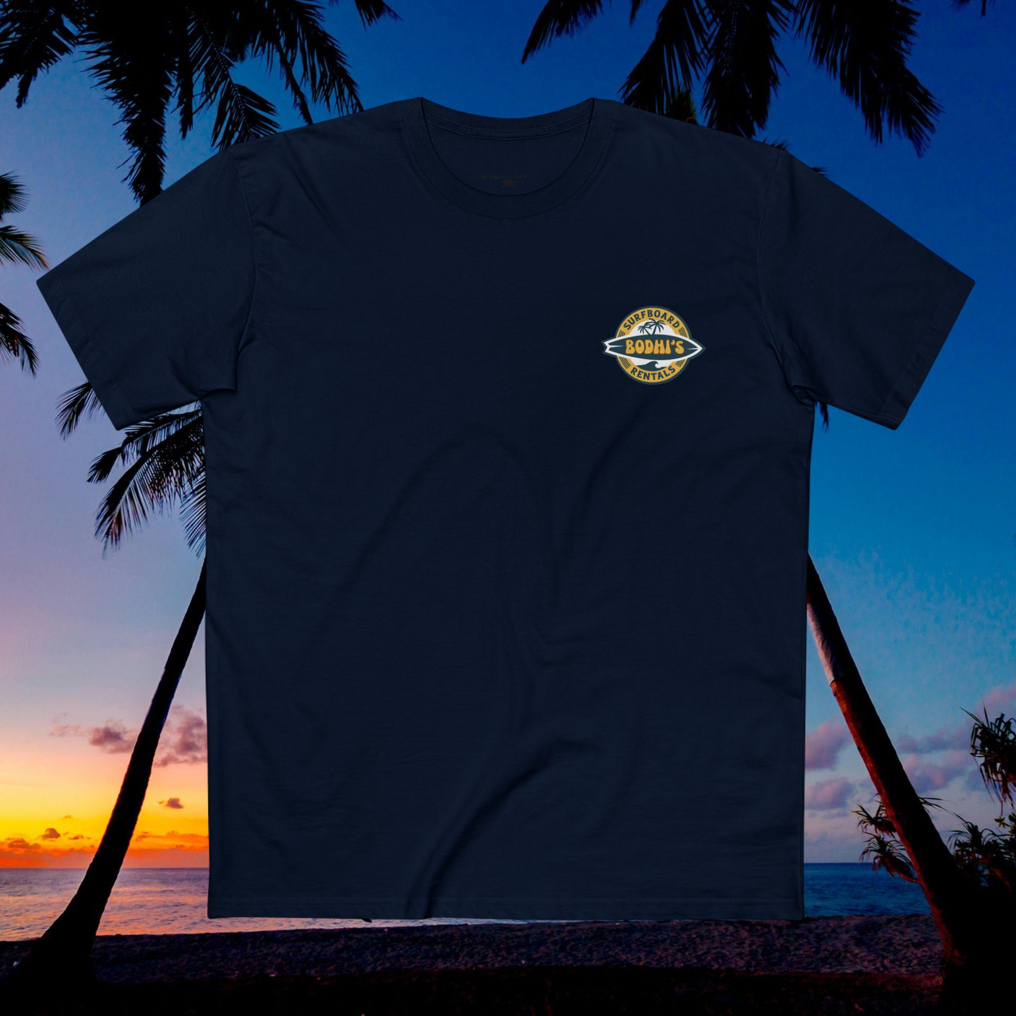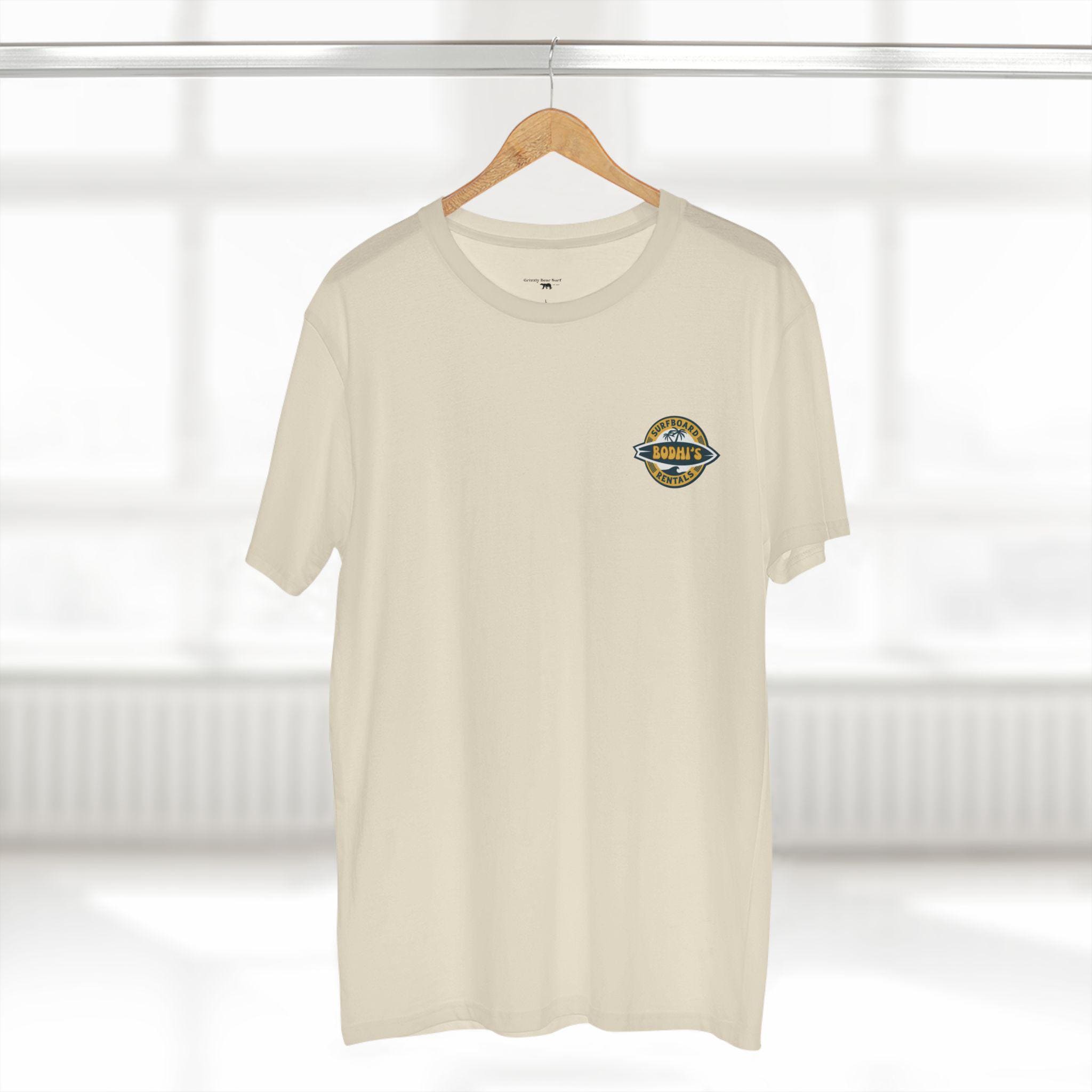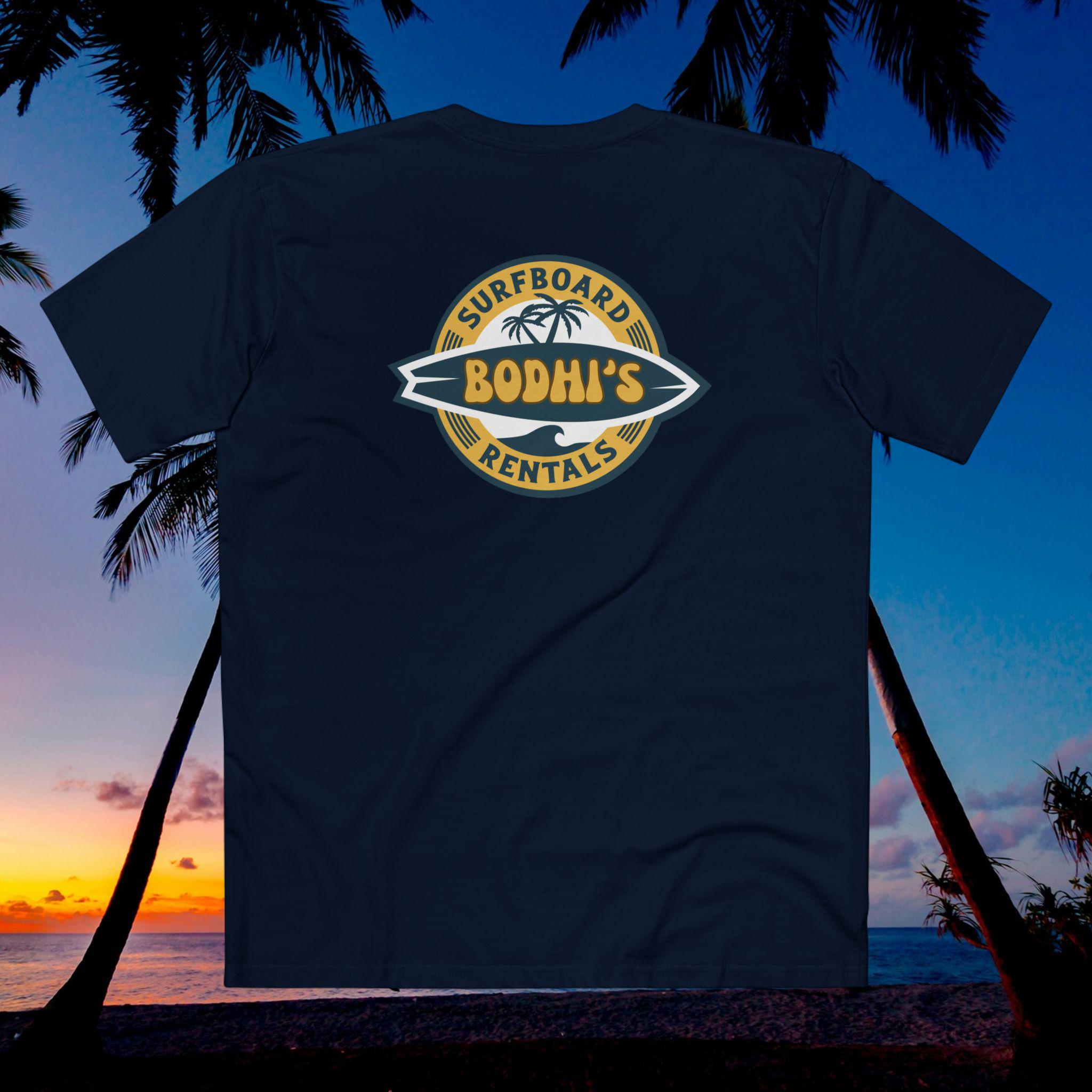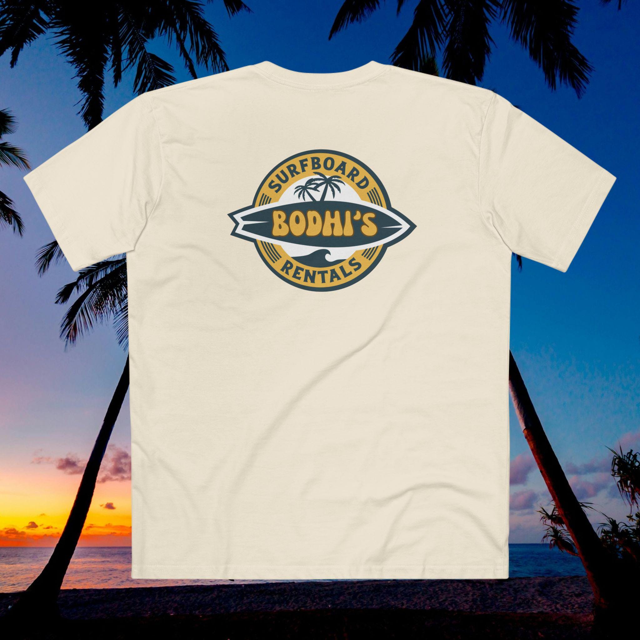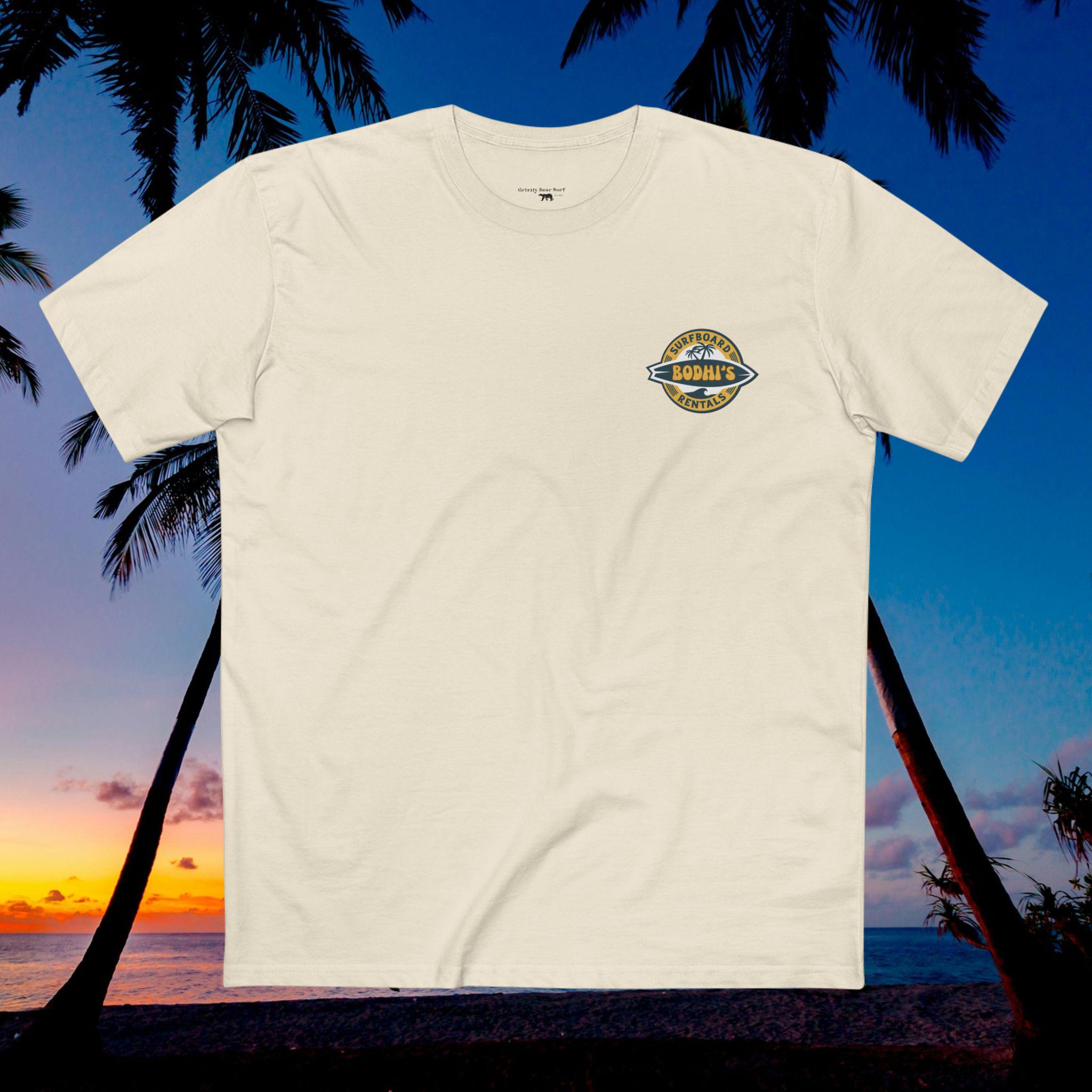 Slip it on after a dawn paddle or before the afternoon tide picks up — the soft, lived-in cotton and steady cut move with you as you scope the sets and wax your board. The Bodhis Surfboard Rentals tee vibe is cheeky and confident: when those points break, you don't hesitate. It sits right at home among reef maps, wax combs, and sun-creased photos, bringing a worn-in crew energy that feels like a nod from your surf crew.