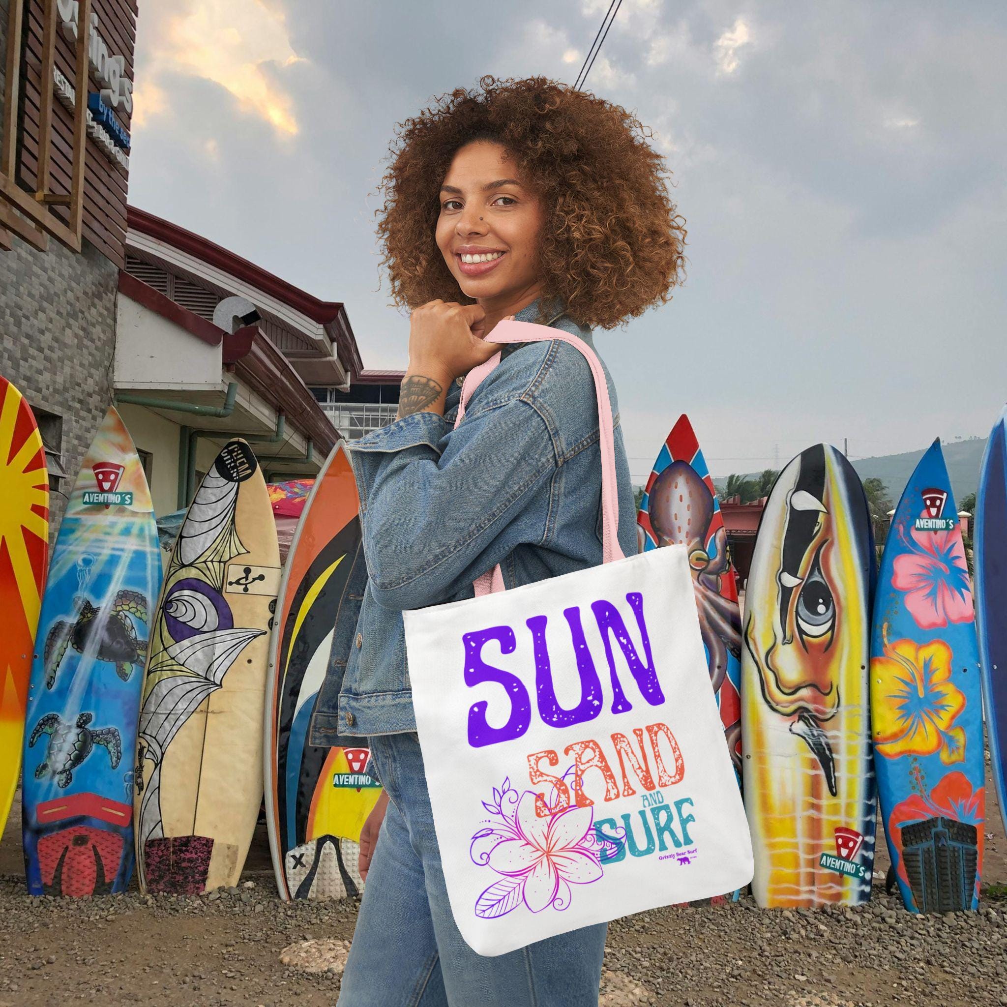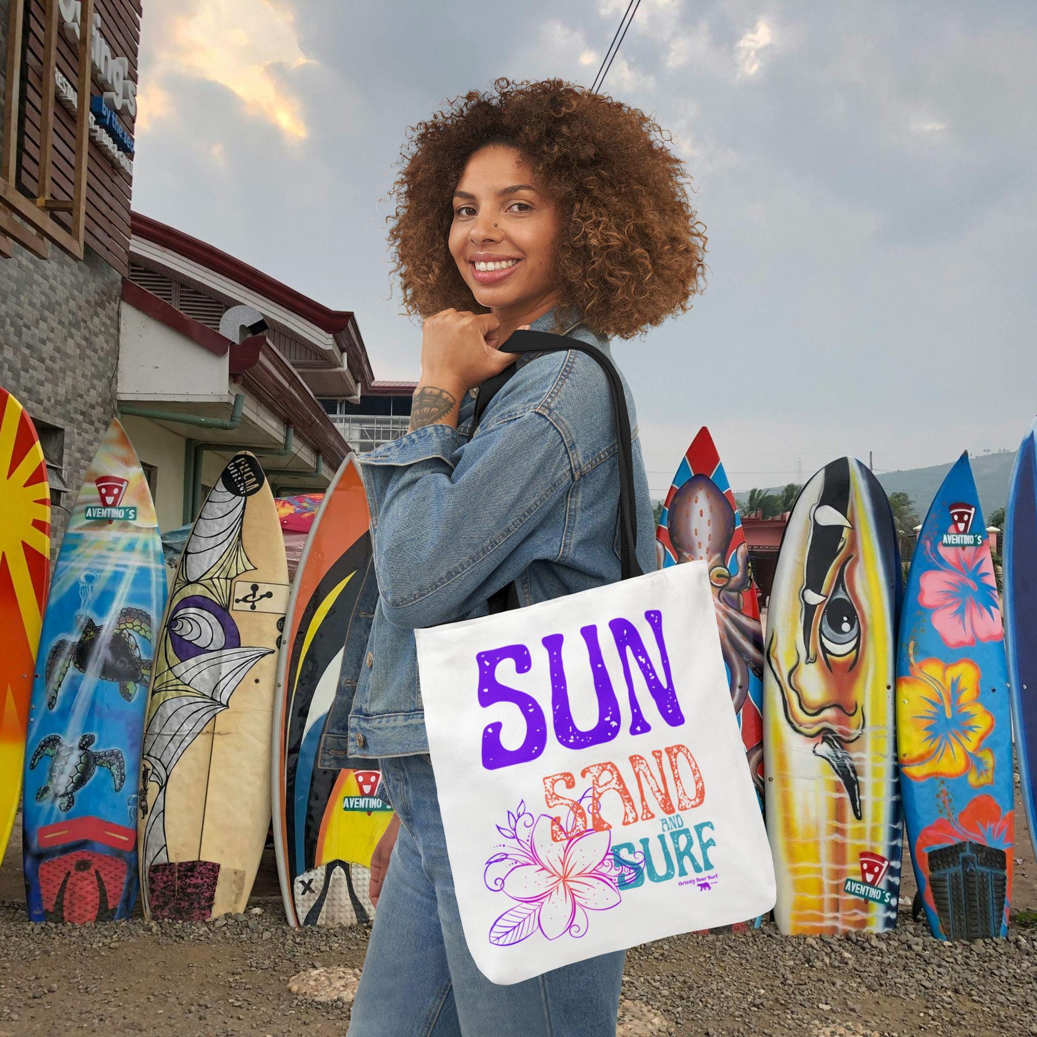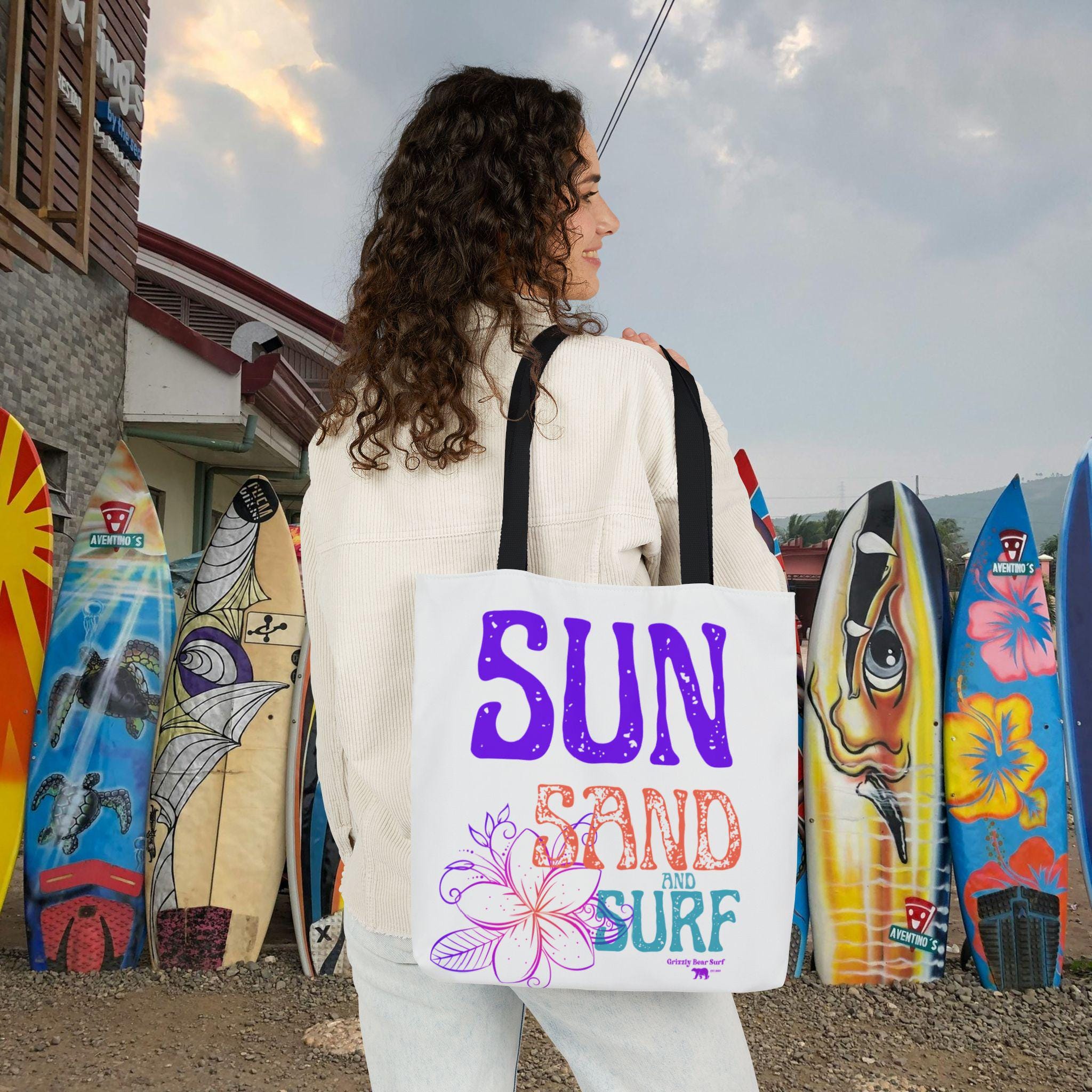 Light salt on your skin, the hush of waves, and a canvas that carries the day’s treasures. This tote slips over your shoulder and becomes the quiet companion of sandy mornings and long afternoons by the water. It holds your towel, sunscreen, a paperback, and whatever little finds you bring back from the shore without folding into a limp afterthought. The bright, all-over print sings of sun, sand, and surf—colors that pop against the dark interior and the choice of bold strap hues. Boxed corners give it room to breathe so shells and bottles sit easy; the fine-weave polyester feels soft but stands up to sand and salt. Bring it to beach days, boardwalk walks, or summer markets where it carries both load and mood.